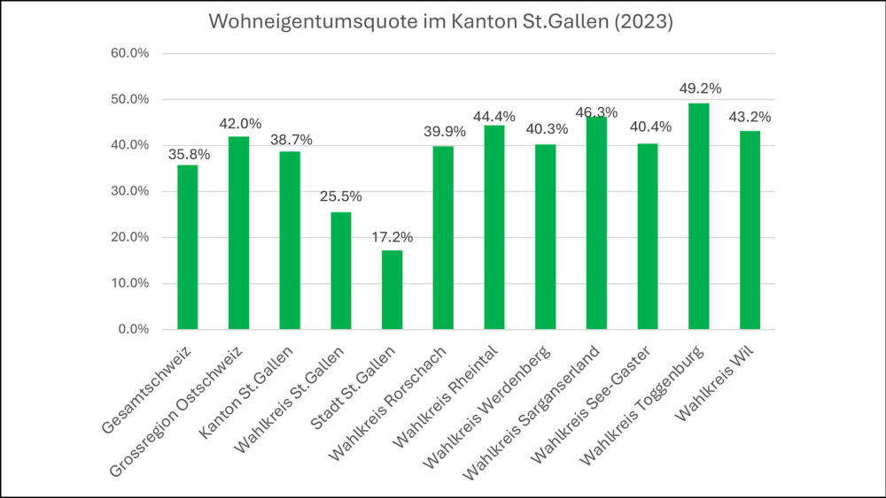Es ist deshalb wenig verwunderlich, dass die Eigentumsquote in den vergangenen Jahren leicht zurückging. 2023 lebten 35.8% der Schweizer Bevölkerung in den eigenen vier Wänden (2018: 36.6%). Im Kanton St.Gallen lag der Wert mit 38.7% (2018: 41.1%) etwas über dem Schweizer Schnitt, in der ganzen Ostschweiz mit 42% (2018: 43.3%) noch etwas höher.