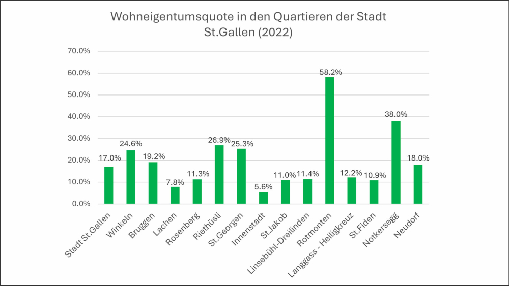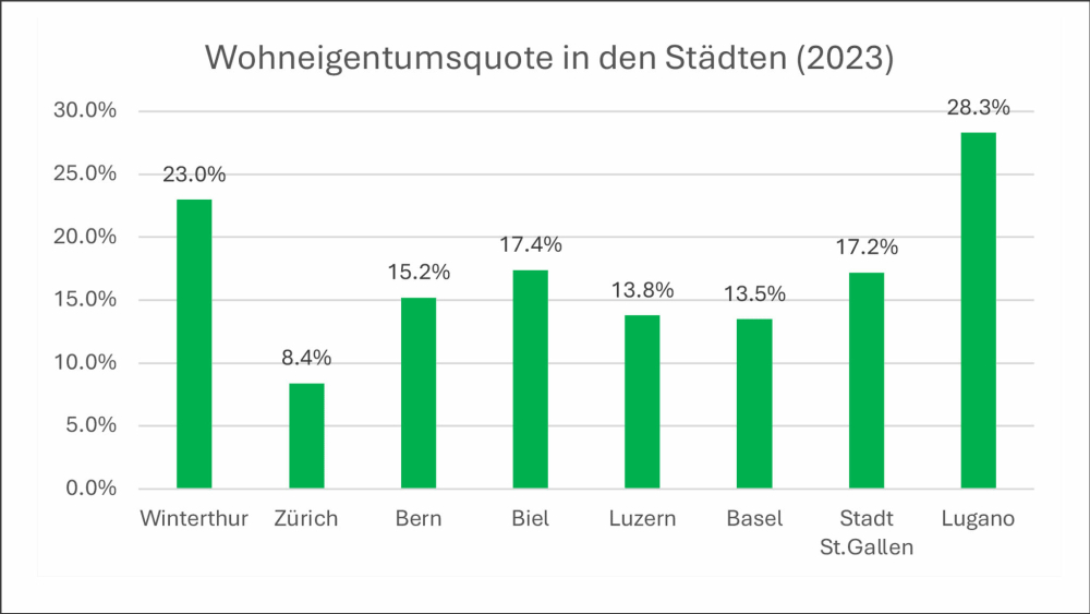 In den Städten fällt der Verdichtungsdruck besonders stark aus, was Angebot und Möglichkeiten für Wohneigentum immer mehr einschränkt. Der Blick auf die grössten Städte der Schweiz belegt dies: Die Wohneigentumsquoten betragen in Zürich 8.4%, in Genf 6.6%, und in Basel 13.5%. Von den zehn grössten Städten weisen Winterthur mit 23.0% und Lugano mit 28.3% eine höhere Wohneigentumsquote als die Stadt St.Gallen aus.